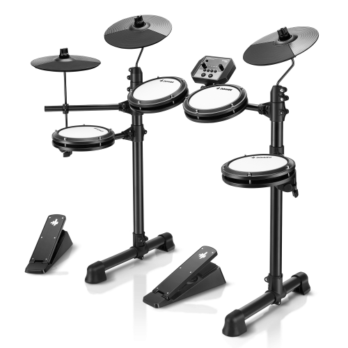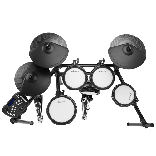 主要功能: 标准五鼓三镲套件、军鼓配置可调整网面弹性装置与Rimshot、50首多风格练习曲、MIDI信号传输、88复音数、支持镲边与镲面的双触发以及制音控制、50组预设鼓组采样、地鼓与hihat为金属踏板、400种音色、可拆卸钢制鼓架、6.5”双层网状高密度结构